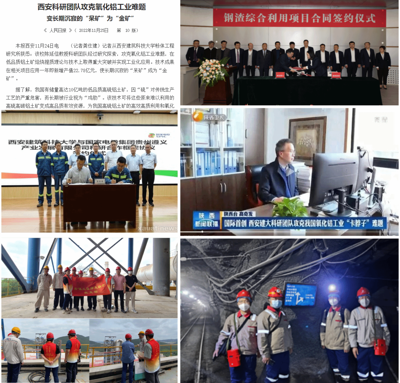 先后以自主研发技术,建成世界首条高硫铝土矿焙烧提质大型工业化生产线,为企业新增产值22.78亿元,项目成果作为西安建大建校以来重大成果首次刊登在《人民日报》纸质版。以钢渣资源化综合利用技术建成国内首条“干法钢尾渣处理系统”钢渣资源化综合利用生产线,先后签订3项EPC总承包项目,合同额累计2.1亿元。建成了34万方/年的矿井充填材料生产系统,技术成果被鉴定为“国际领先”。