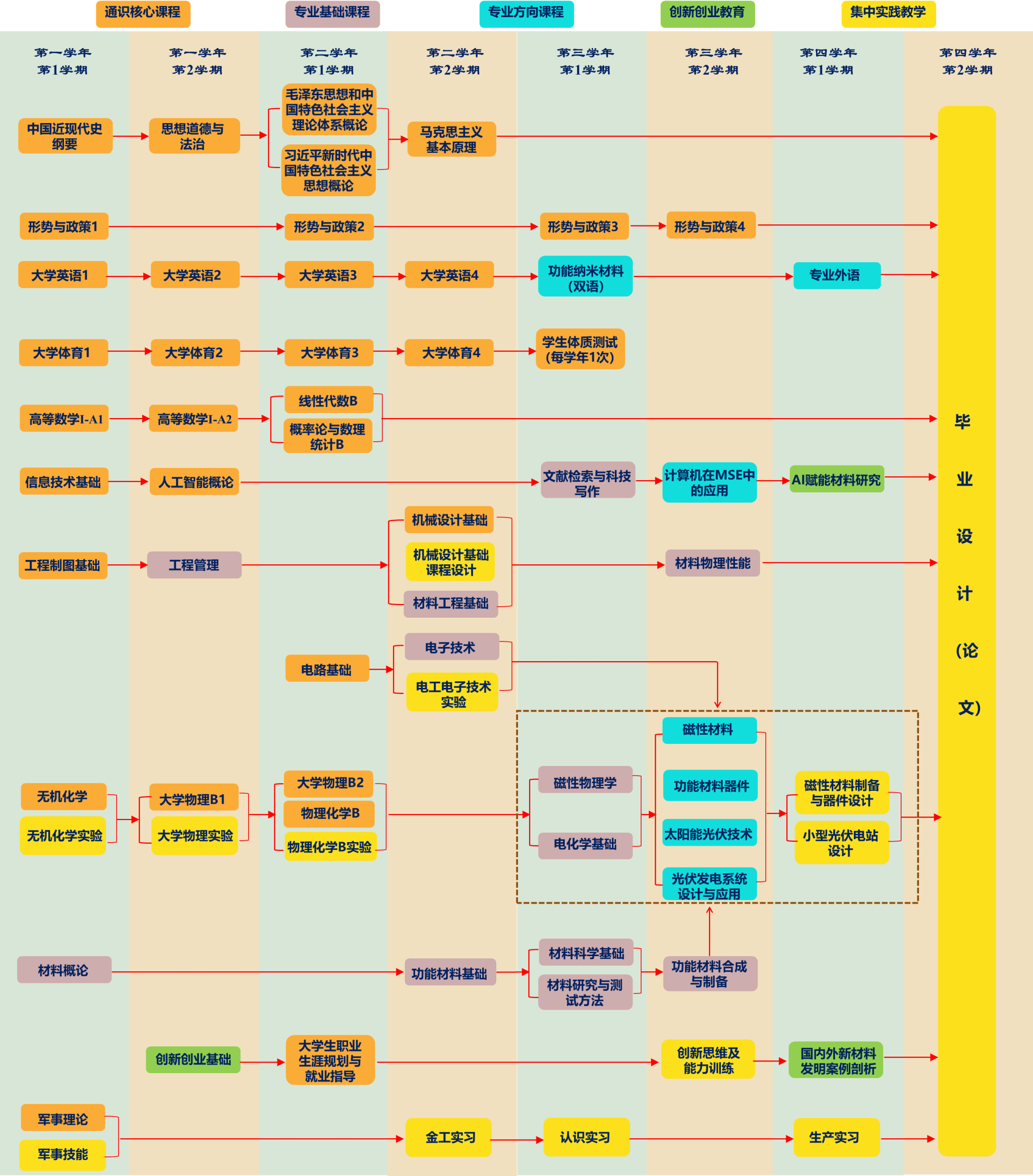 针对我国战略性新兴产业相关领域发展对人才的需求,本专业旨在培养德智体美劳全面发展,具有较强的家国情怀、扎实的数理基础、良好的科学素养和系统的专业知识,能够综合运用功能材料专业基础理论和相关专业知识,解决磁性材料和新能源材料行业复杂工程问题,能胜任相关领域的科学研究、工艺设计、生产管理、技术开发、推广应用等方面的工作,具有较好的团队协作精神与合作能力、组织沟通能力、可持续发展意识和一定国际视野的高素质专门人才。
