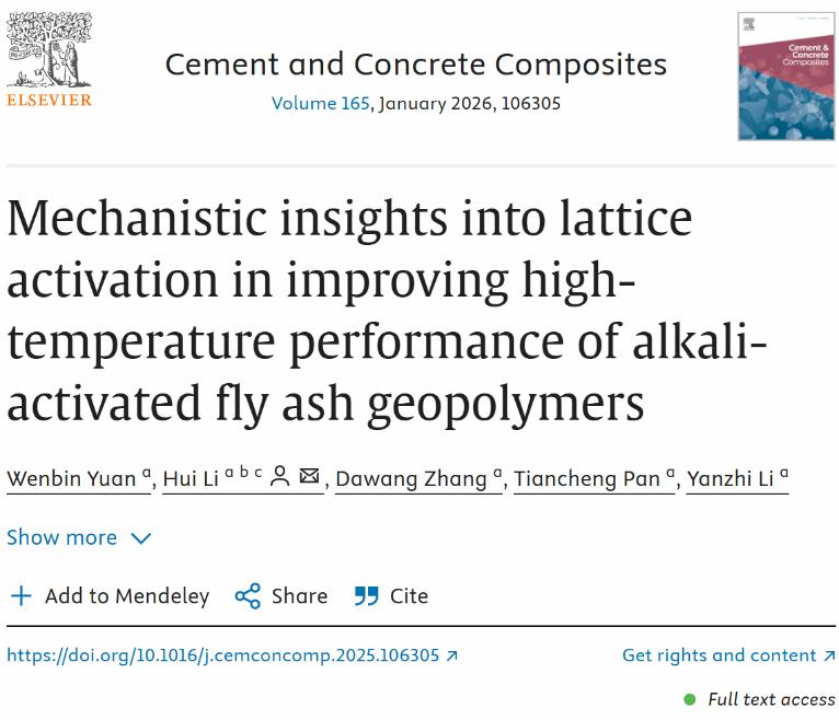 近日,我校材料科学与工程学院李辉教授团队在国际顶级期刊Cement and Concrete Composites(中国科学院分区SCI一区Top;IF=13.1)上发表题为Mechanistic insights into lattice activation in improving high-temperature performance of alkali-activated fly ash geopolymers的论文。李辉教授为唯一通讯作者,博士研究生袁文滨为第一作者,西安建筑科技大学为论文的独立完成单位。